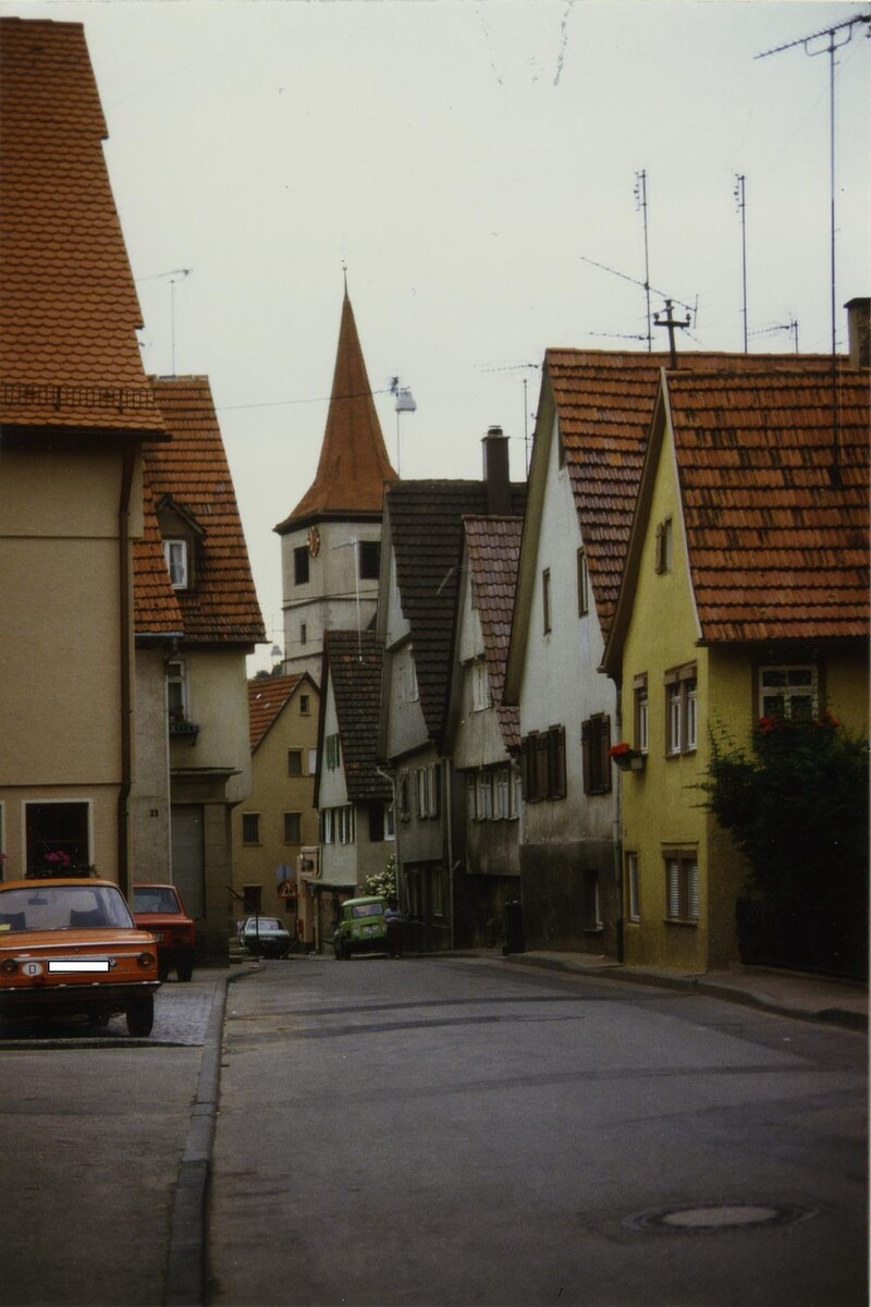 So schön schneebedeckt war die damalige Bissinger Hauptstraße als Heidemarie Friedrich für einen Fotowettbewerb das Bild 1968 schoss. 1975 wurde die Straße in Jahnstraße umbenannt. Links kann man das Schild „Elektro Radio Benz“ des Elektrogeschäfts von Robert Benz erkennen. Gegenüber war das Lebensmittelgeschäft der Familie Ehrmann und das Schneidergeschäft von Fritz Klein. Im Hintergrund ist das Gasthaus Rebstock von Albert Schrempf zu sehen. Hinter dem Elektrogeschäft war außerdem das Schuhwarengeschäft von Emil Weidenbach. Das zweite Foto wurde aus derselben Perspektive im Jahr 1984 geschossen.