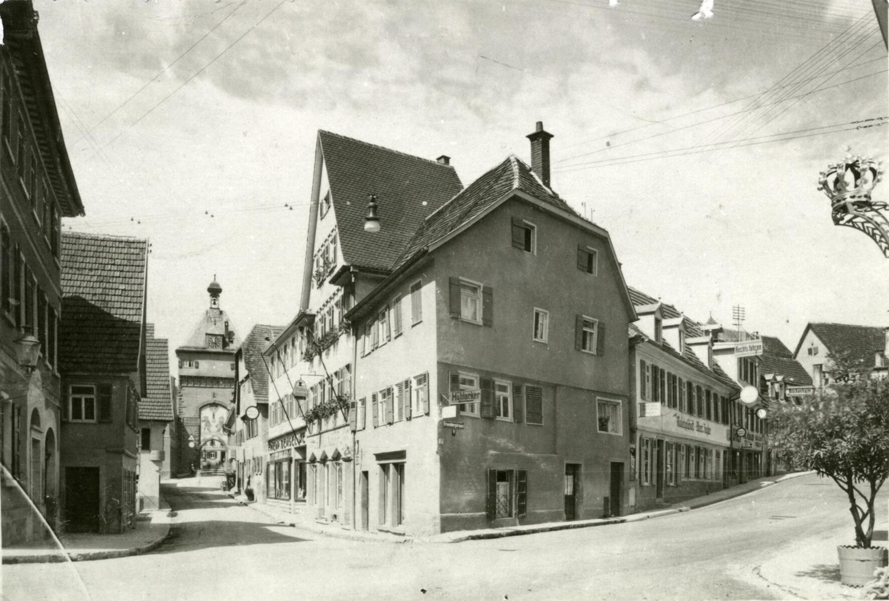 Foto 1: Vorne das Friseurgeschäft Pfeiffer-Wöhrle, dann der markante Dachstuhl des „Hut-Neff“, daneben der Bengel’sche Laden und das Haus des Seilers Schumacher, 1930er