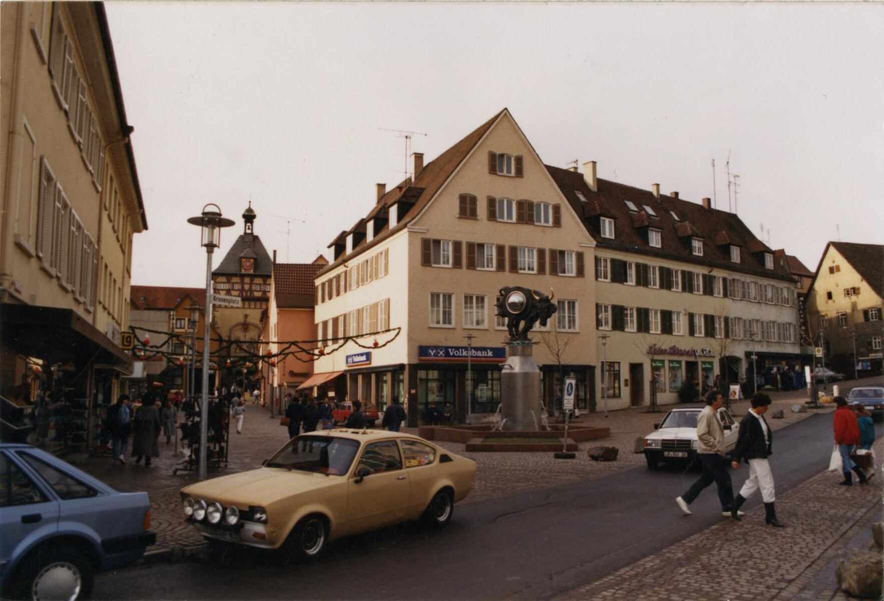 Beim Brand des Kronenbergs 1945 vernichtete ein Feuer fast die gesamte Nordseite der Brückenvorstadt beim Unteren Tor. Das Feuer wurde im Laden des Uhrmachermeisters Köhler am Kronenbuckel gelegt. Mehrere Gebäude fielen den Flammen zum Opfer. Das Friseurgeschäft Pfeiffer-Wöhrle an der Ecke Kronenberg/Hauptstraße wurde von Rudolf Pfeiffer aufgebaut und nachdem er im Krieg gefallen war von dessen Frau und Kindern weitergeführt. Daneben auch das Putzgeschäft (sich herausputzen = modisch kleiden) von Emil Neff, später verkaufte er Hüte und nannte seinen Laden „Hut-Neff“. 1927 setzte er auf seinen Laden einen gewaltigen Dachaufbau, der die übrige Dachlandschaft deutlich überragte. In der Hauptstraße 4 hatte die Familie Ruoff einen Gemischtwarenladen. Das Gebäude befand sich auf dem Areal, das ursprünglich zum Gasthaus „Zum Grünen Baum“ gehörte, das am Kronenbuckel lag und sich bis zur Hauptstraße zog. 1931 erwarb die Witwe Friedrich Bengels das Ruoff’sche Anwesen und verlegte ihr Aussteuergeschäft, das die Tochter Martha führte, dorthin. Auch das Haus des Seilers Wilhelm Schumacher (1874-1942), dessen Familie das Geschäft in der fünften Generation betrieb, brannte nieder. 1952 war der Wiederaufbau des Kronenbergecks abgeschlossen. Es war die erste große Baumaßnahme im Wohnungsbau in der Stadt nach 1945.