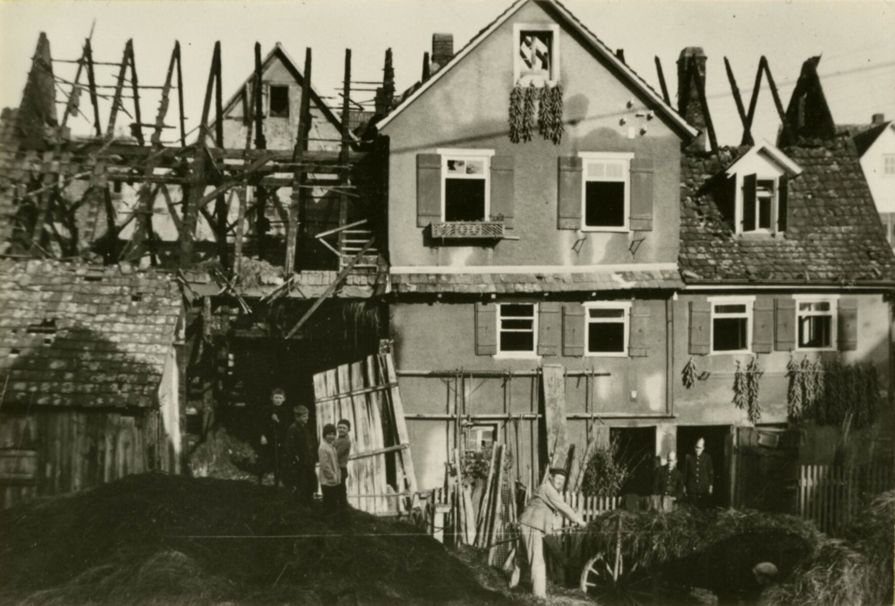 Am Abend des Totensonntags, am 21. November 1932, schreckten die Feuerglocken die Metterzimmerer Einwohner auf. In der Scheune des Baumwarts Gottlieb Link war ein Brand ausgebrochen. Die Metterzimmerer Feuerwehr begann mit den Löscharbeiten und wurde von der Bietigheimer Feuerwehr mit ihrer Motorspritze unterstützt. Bald ging aber das Löschwasser aus und in ihrer Not griffen die Floriansjünger zu einem anderen Löschmittel: Gülle! Die Scheune mit den darin lagernden Vorräten wurde vollständig vernichtet. Das Wohngebäude, dort steht heute das Haus Mozartstr.2, wurde schwer beschädigt. Menschen kamen nicht zu Schaden und ein Übergreifen des Brandes auf die Nachbargebäude konnte verhindert werden.