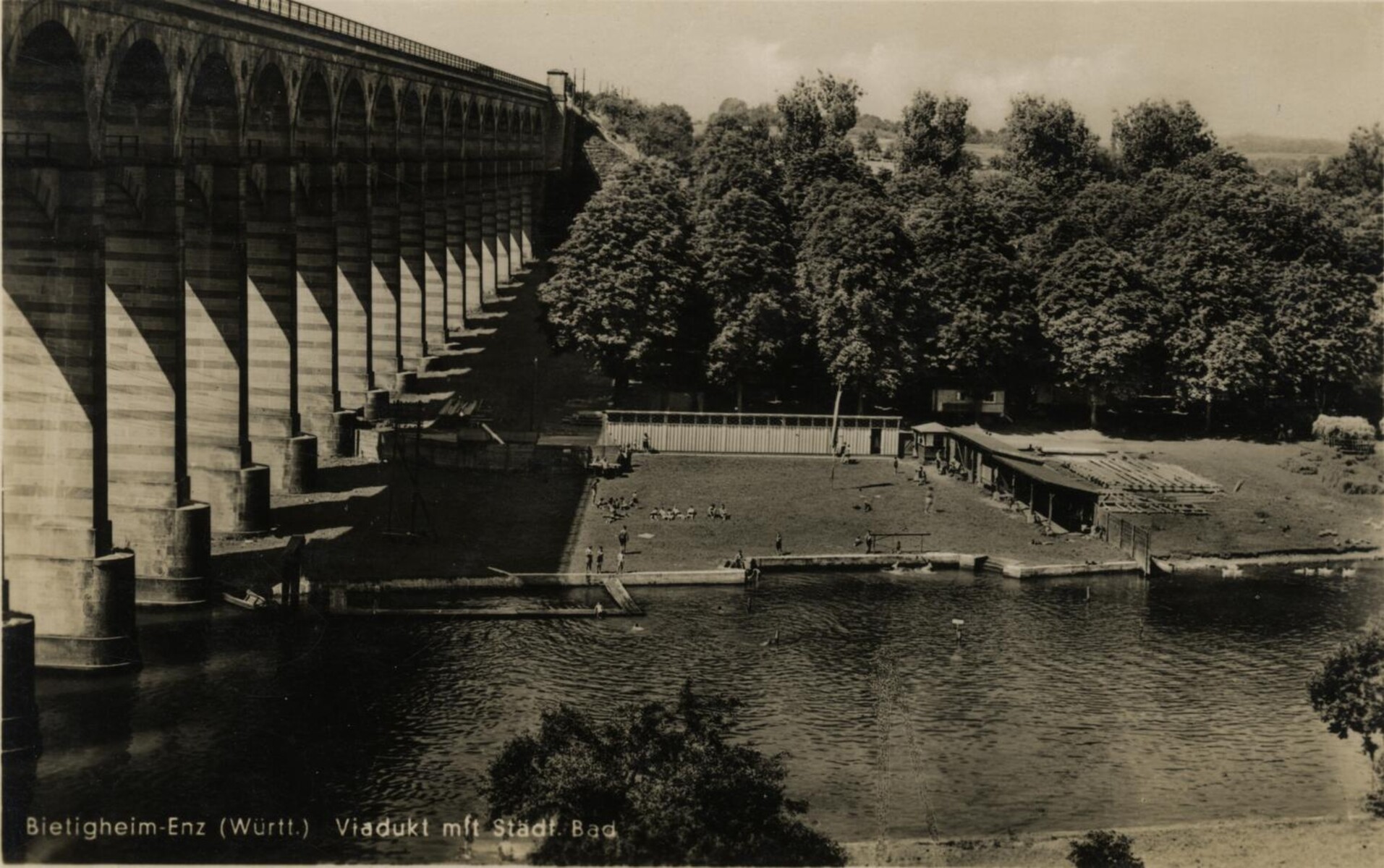 Das Foto, eine Ansichtskarte aus der Zeit um 1930, zeigt das Bietigheimer Enzfreibad am Viadukt, hier als „Stadt Bad“ bezeichnet.