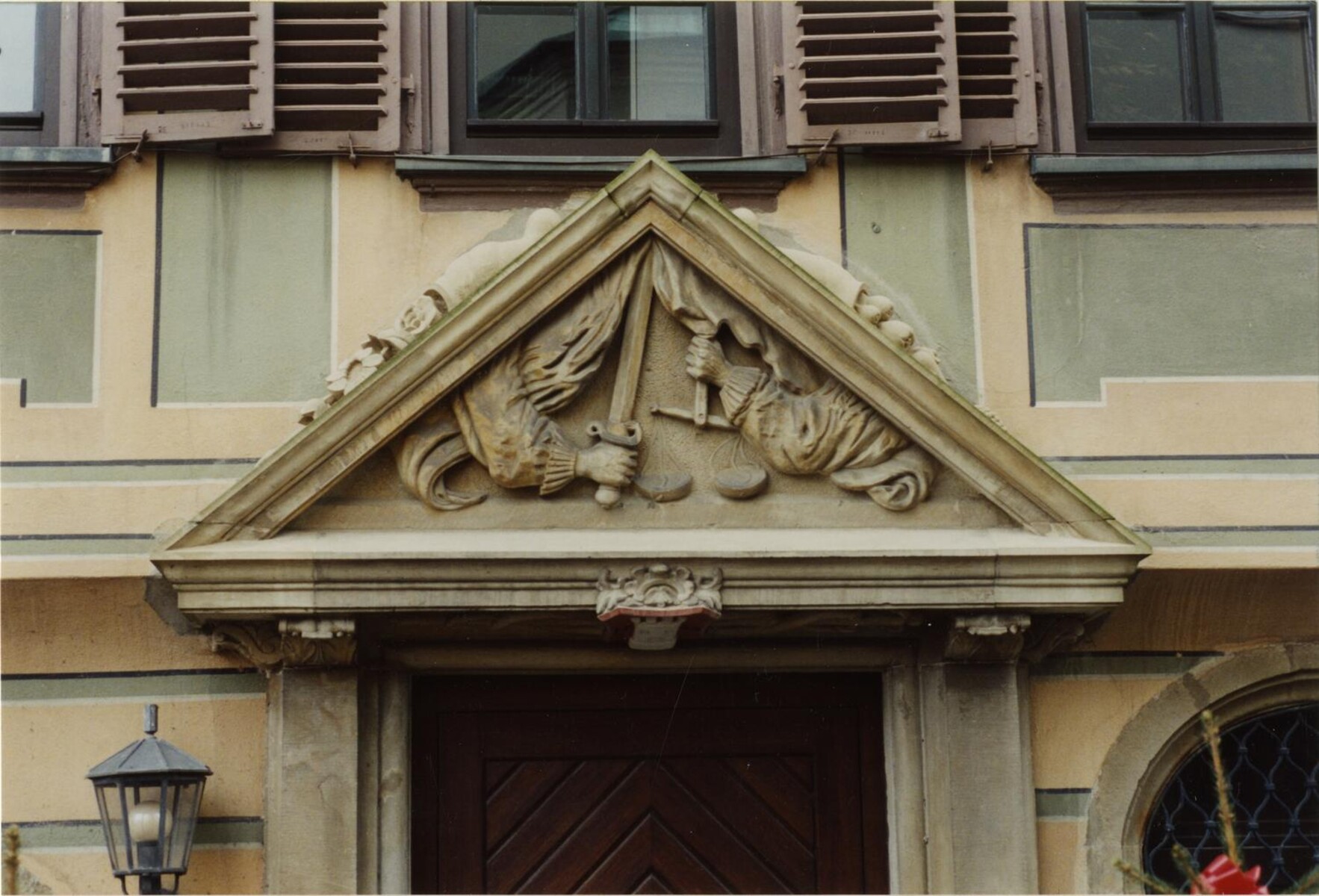 Was bedeuten die Symbole am Nordeingang des Rathauses? Das repräsentative Nordportal wurde 1783 angelegt. Auf das Portal wurde ein Giebelfeld gesetzt, das bildhaft einige Stadtrechte darstellt. Im Zentrum des Giebelfelds sind das Richtschwert und die Waage der Gerechtigkeit zu sehen. Beide symbolisieren die Hochgerichtsbarkeit der Stadt, also das Recht Rechtzusprechen und über Leben und Tod zu entscheiden. Auf dem Giebeldreieck ruhen zwei Füllhörner mit Weintrauben, die für den Weinbau stehen. Auf der Unterseite des Dreiecks ist ein Stab mit zwei Schlangen, der an seinem oberen Ende Flügel hat und mit dem Bietigheimer Wappen, begleitet von der Jahreszahl 1783, belegt ist. Es handelt sich bei dieser Darstellung um den Merkurstab, der das alte Zeichen der Handelsfreiheit ist. 1926 wurde das Nordportal geschlossen und der Eingang auf die Ostseite verlegt. Im Rahmen eines größeren Umbaus und Sanierung wurde 1980 das Nordportal wieder geöffnet und später, 1992, von Steinmetz Melchior aus Freudental restauriert.