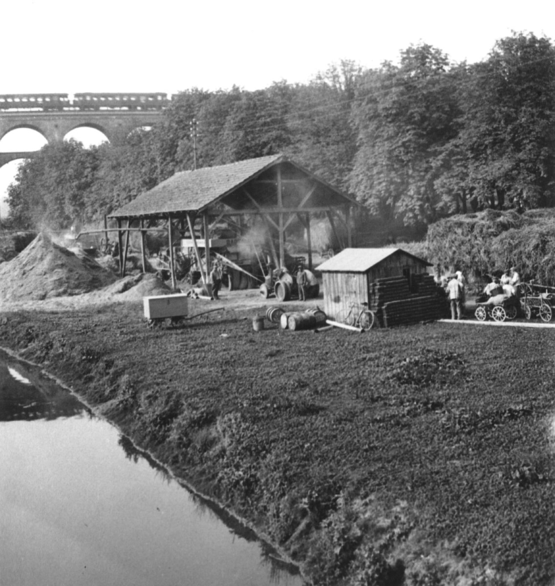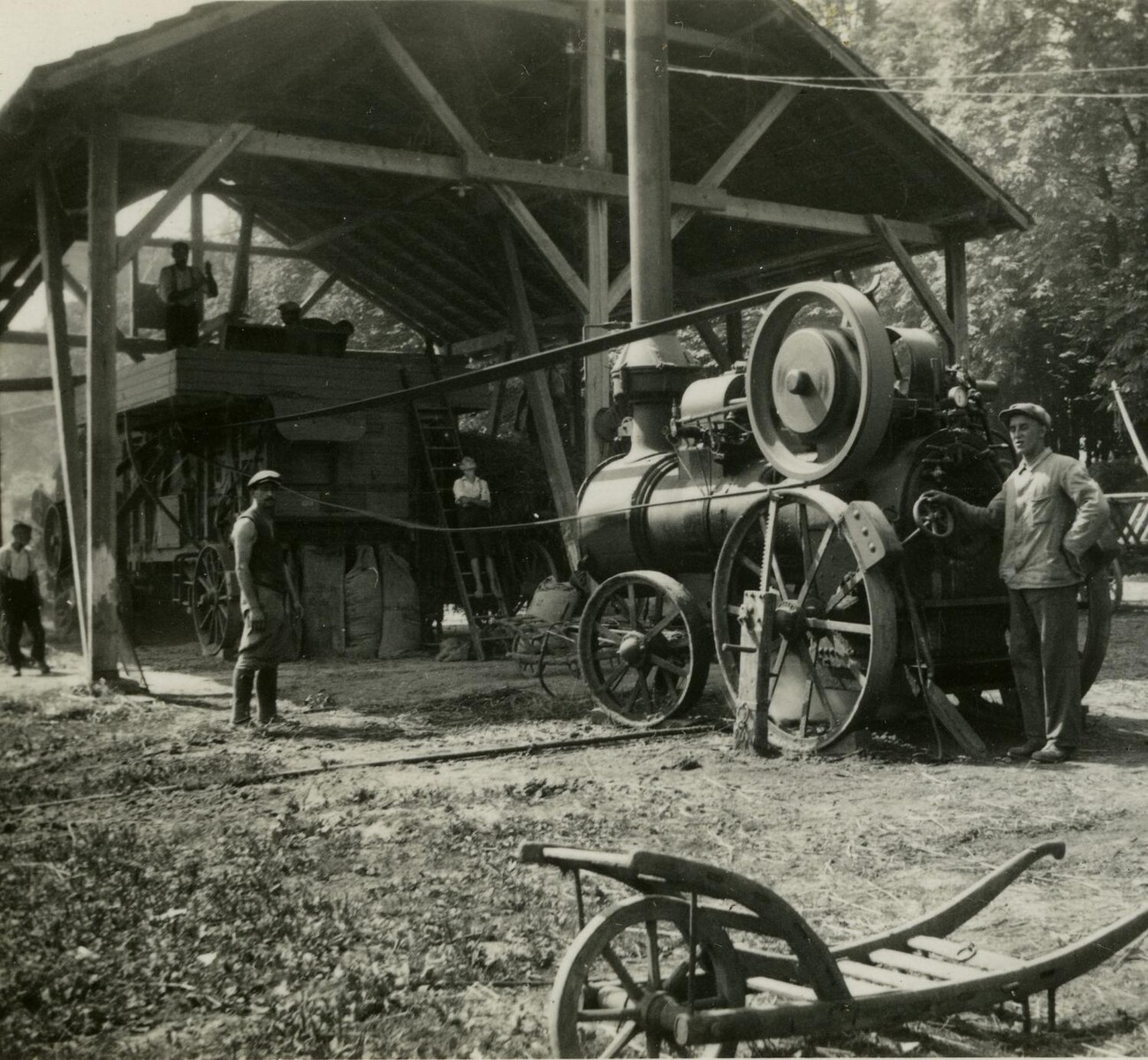 Dreschmaschine im Dreschschuppen an der Enz in den 1920er Jahren (Fotograf ist unbekannt); im Hintergrund sind die Kastanien des Festplatzes zu sehen.