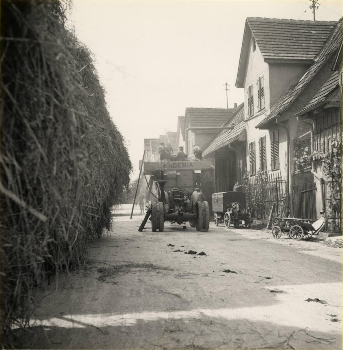 Dreschmaschine in der Hindenburgstraße im August 1940, aufgenommen vom Fotograf Otto Kienzle.