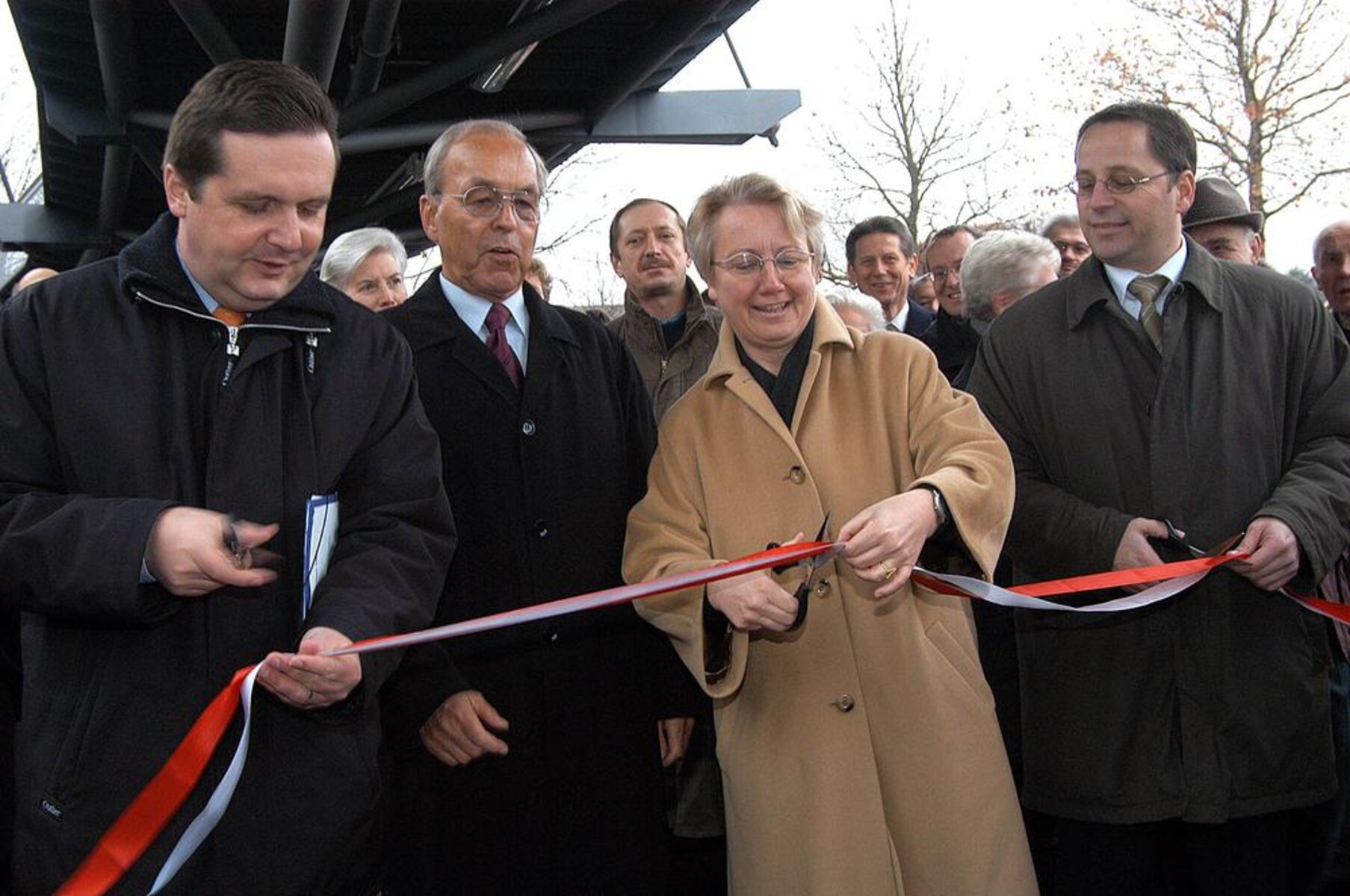 1 Das Band wird durchschnitten: von links Staatssekretär Stefan Mappus, Oberbürgermeister Manfred List, Kultusministerin Annette Schavan und Bahnhofsmanager Jürgen Lang