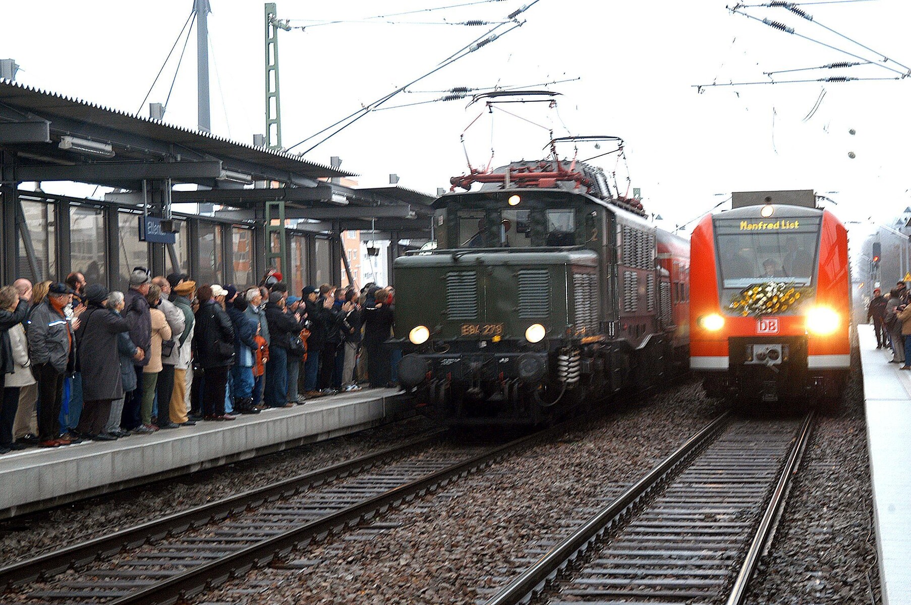 3 Zwei Sonderzüge: links ein Zug mit einem historischen Triebwagen, dem „Deutschen Krokodil“ und rechts ein moderner Nahverkehrszug