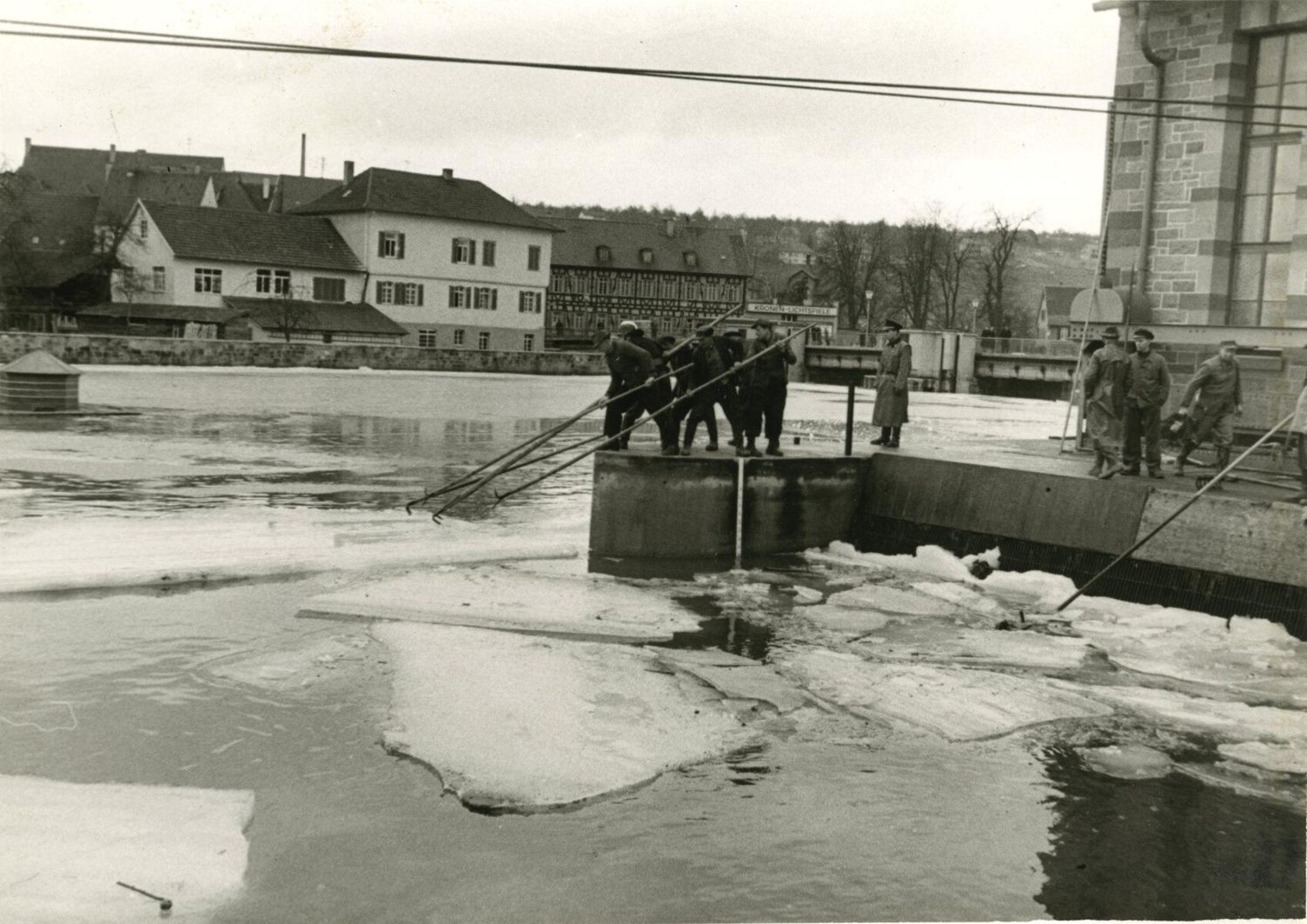 Diese winterliche Szene an der Enz beim Enzkraftwerk hat der Bietigheimer Fotograf Otto Kienzle festgehalten. Während eines sehr kalten Winters trieben große Eisschollen auf der Enz. Die Männer versuchten mit langen Stangen, die Eisschollen auf die Seite Richtung Enzkraftwerk zu ziehen, damit sie nicht in Richtung Enzbrücke schwimmen konnten.