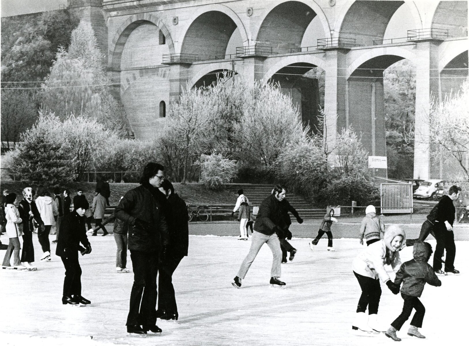 Wintervergnügen für Kinder und Erwachsene vor 50 Jahren. Bevor es in Bietigheim-Bissingen eine Eishalle gab, konnte man beim Viadukt auf einer Eisbahn Schlittschuh laufen. Wenn es kalt genug war, pumpte die Bietigheimer Feuerwehr Wasser auf einen Sportplatz und schuf so eine Eisbahn, die für alle kostenlos zu Benutzen war. Es gab sogar Flutlicht in den Abendstunden. Das Foto, aufgenommen vermutlich von Alfred Drossel, zeigt die Eisbahn im Ellental 1973.