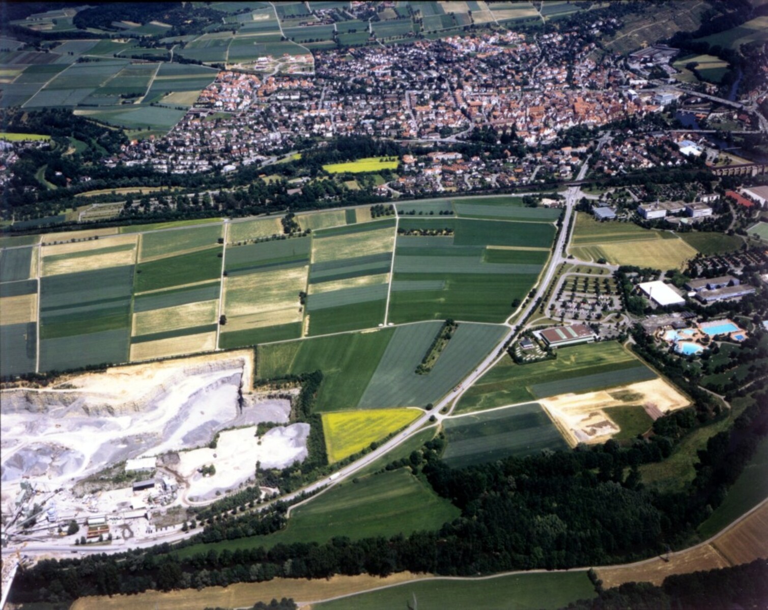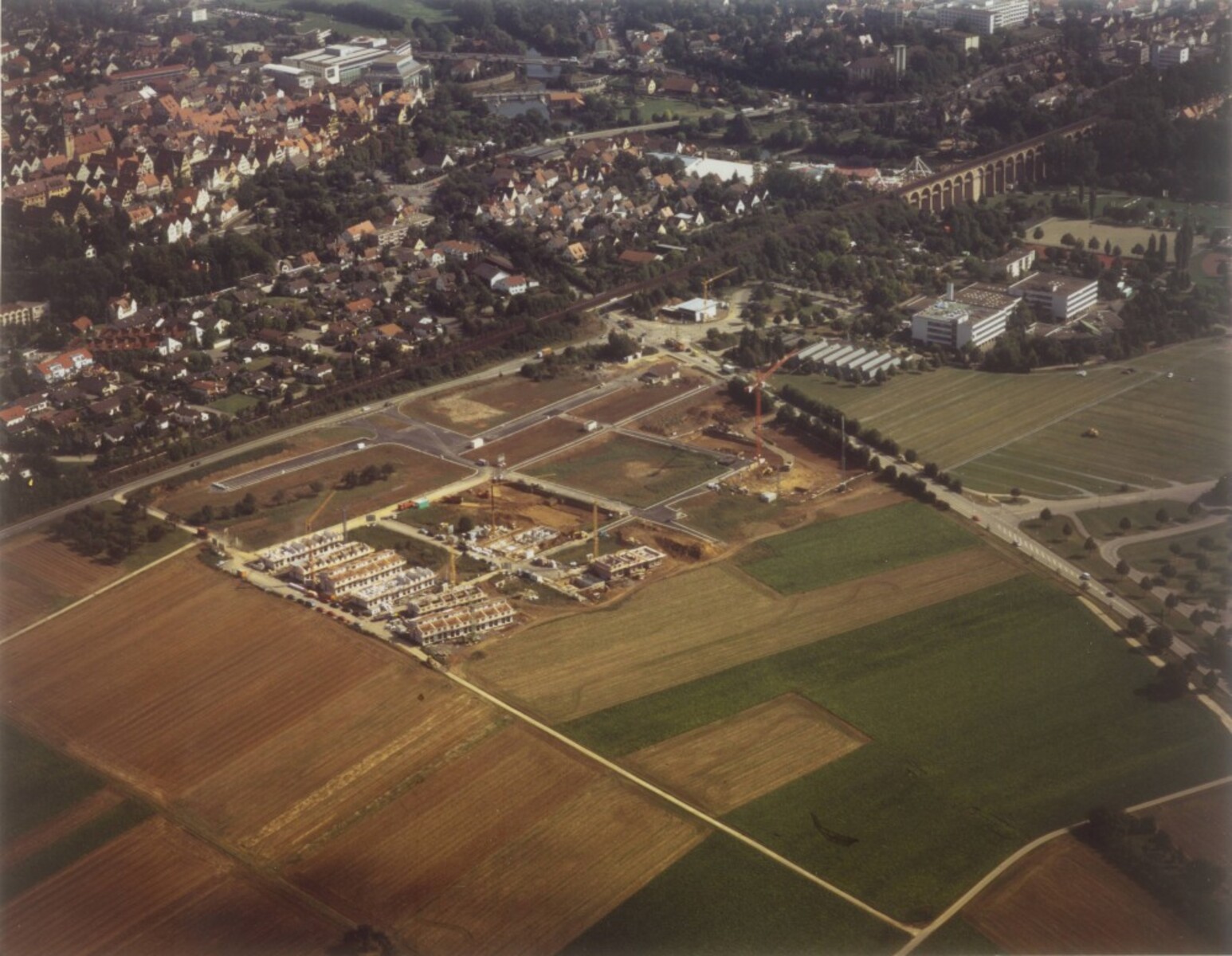 Genau vor 25 Jahren, am 24. Oktober 1997 erfolgte der 1. Spatenstich zum neuen Wohngebiet Kreuzäcker. Die Erschließungsarbeiten sollten bis zum Sommer 1998 abgeschlossen sein. Die beiden Luftbilder von Riemann Aero-Photo zeigen das Gebiet am 10. Juni 1997 vor Beginn der Bauarbeiten und am 4.September 1998. Ein knappes Jahr nach dem Spatenstich sind die Straßen des ersten Bauabschnitts fertig und bereits einige Häuserzeilen gebaut.
