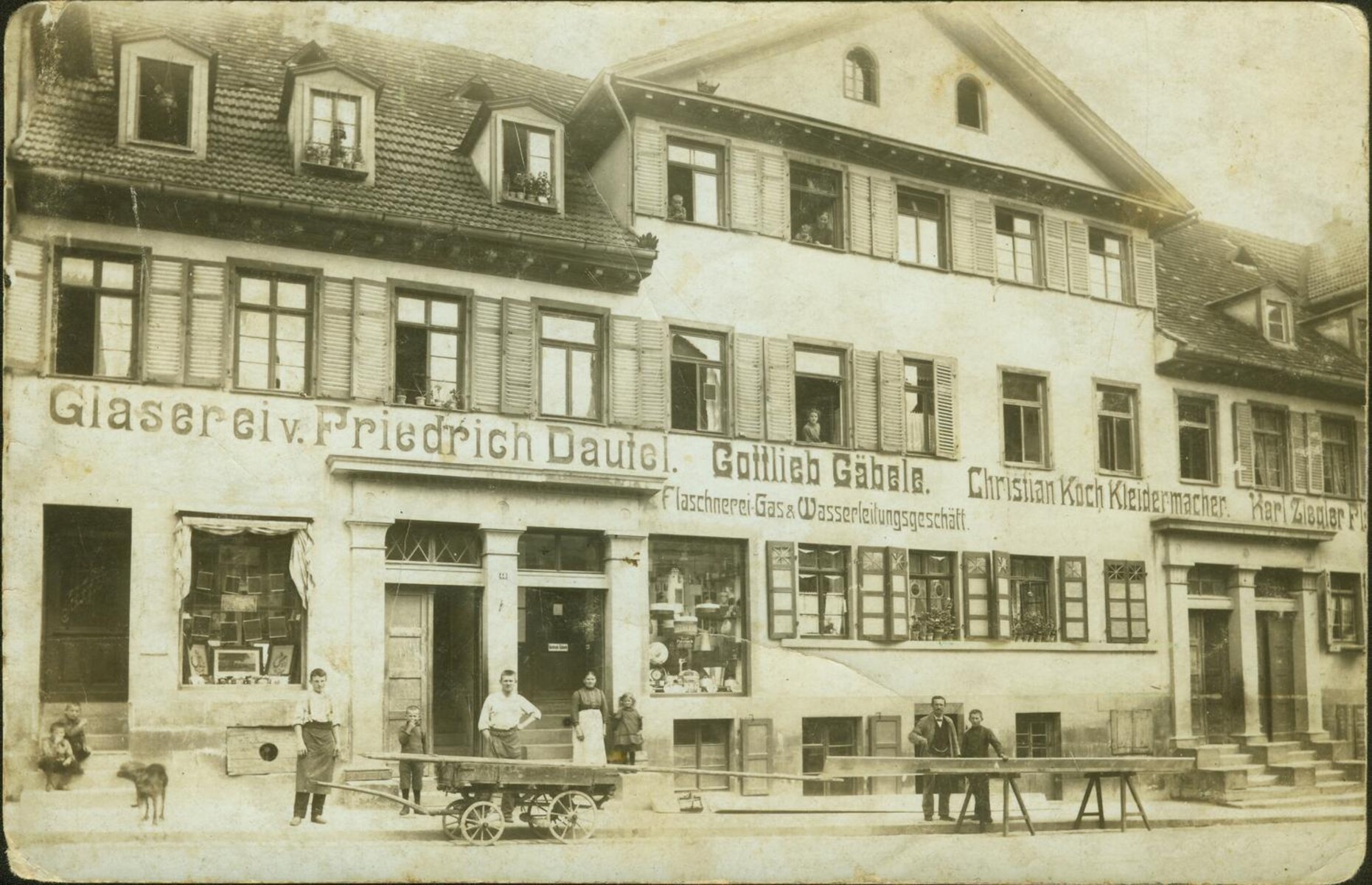 Diese Straßenszene in der Bietigheimer Hauptstraße wurde um 1910 festgehalten. Der sogenannte „Neue Bau“ (Hauptstraße 36-44) wurde nach einem Großbrand 1831, bei dem zahlreiche Häuser abbrannten, errichtet. Während in den oberen Stockwerken gewohnt wurde, waren im Erdgeschoss verschiedene Geschäfte und Handwerksbetriebe untergebracht. Links steht Glasermeister Friedrich Dautel senior mit seiner Familie vor seinem Hauseingang. Im Schaufenster links vom Eingang sind Bilderrahmen und Spiegel zum Verkauf ausgestellt. Rechts steht Flaschnermeister Gottlieb Gäbele, vermutlich mit einem Lehrling. Seine Werkstatt befand sich im Untergeschoss, darüber seine Wohnung und sein Laden. Im Schaufenster erkennt man Gas-Zimmerlampen. Die Flaschnerwerkstatt übernahm später der Flaschner Kinzinger.