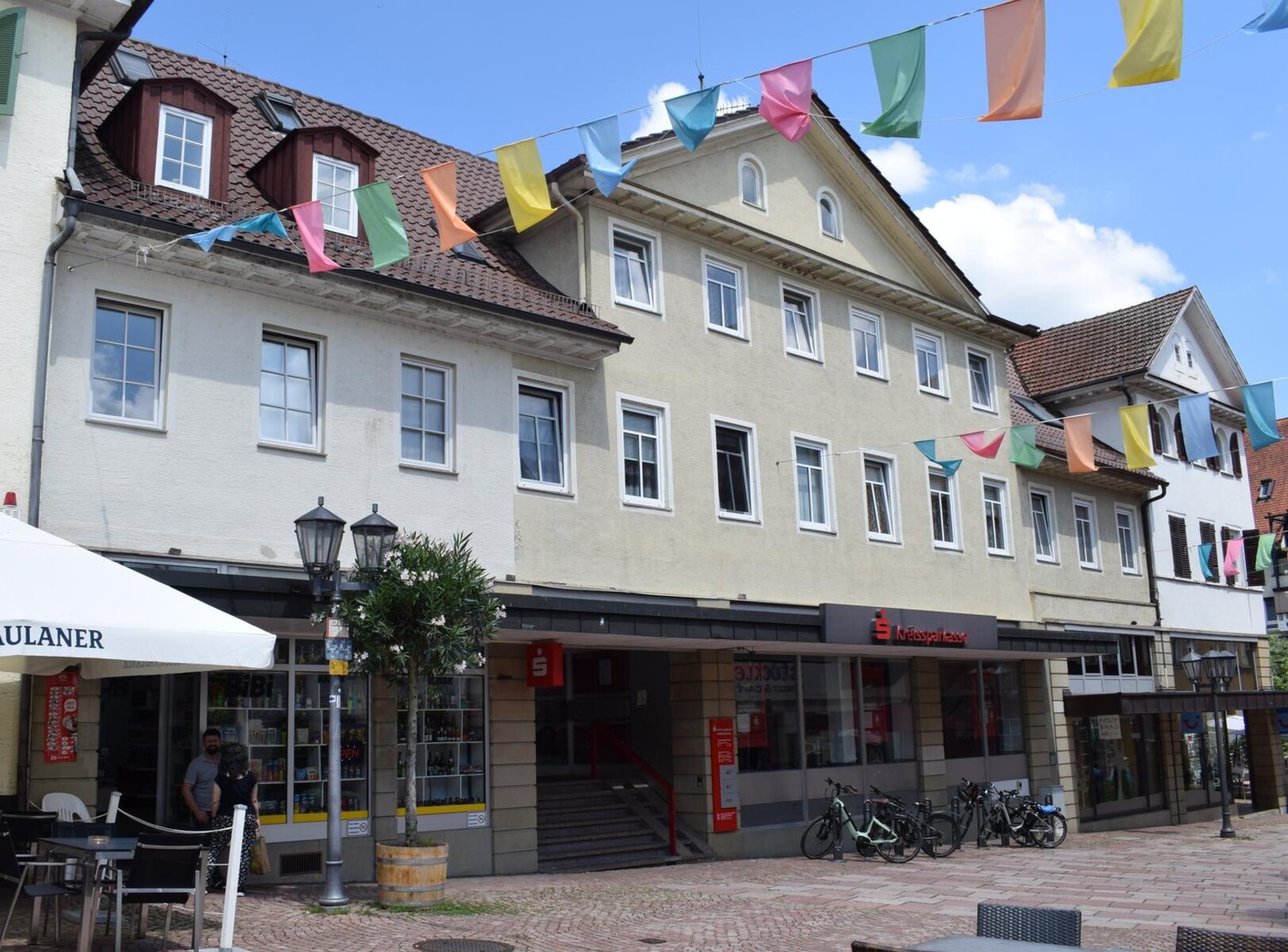 Der Eingang rechts führte zur Wohnung und Schneiderwerkstatt von Schneidermeister Koch im 2. Stock. Ganz rechts schloss sich die Flaschnerei von Karl Ziegler an. Den Abschluss des „Neuen Baus“ auf der rechten Seite bildete Eisenwaren Irion (auf dem Foto nicht zu sehen). Am oberen Ende gegen den heutigen Markplatz war schon damals der „Falken“. Dort, wo einst fleißige Handwerker ihre Werkstätten und Läden hatten, befindet sich heute die Kreissparkasse.