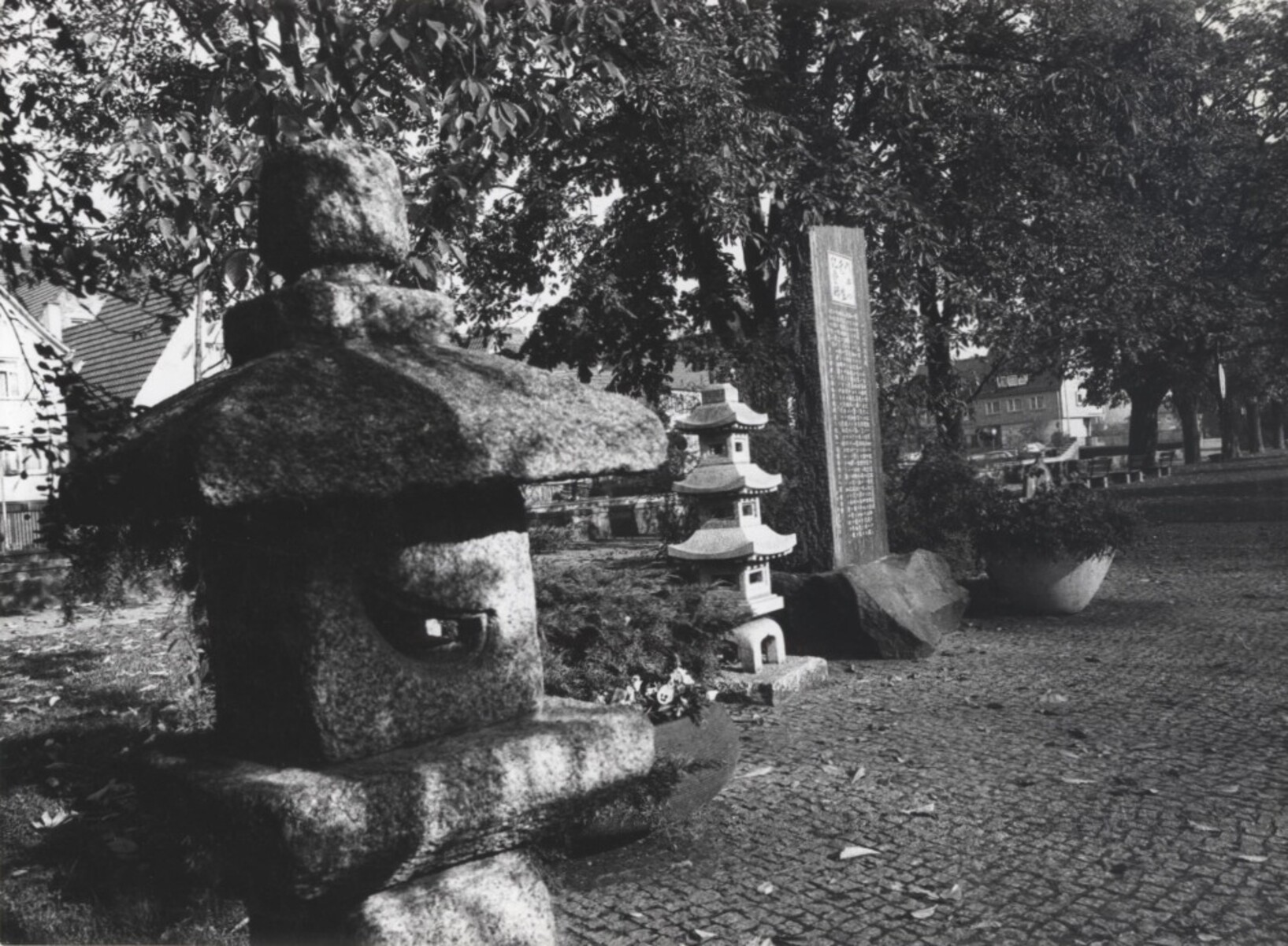 1961 besiegelten Bietigheim und der durch seine heißen Quellen bekannt gewordene japanische Ort Kusatsu eine Städtepartnerschaft, die ein Jahr später in Kraft trat. Seitdem erhielt die Stadt immer wieder aus Japan Steinobjekte wie Gedenksteine, Laternen u.a. als Geschenke. Sie wurden an der Metteranlage aufgestellt und die Umgebung bepflanzt. Das waren die Ursprünge des frühen Japangartens, wie sie auf dem ersten Foto (Autor: Alfred Drossel) aus dem Jahr 1976 zu sehen sind.