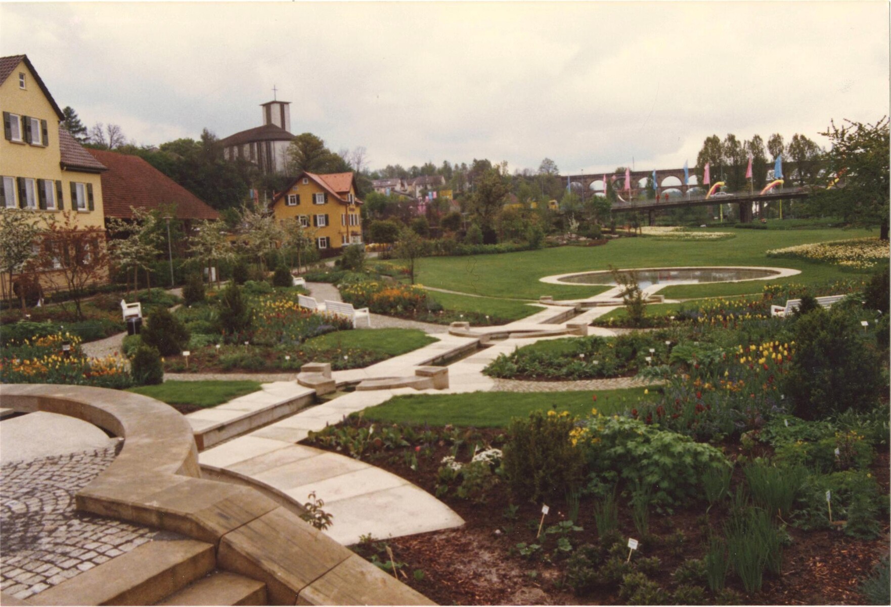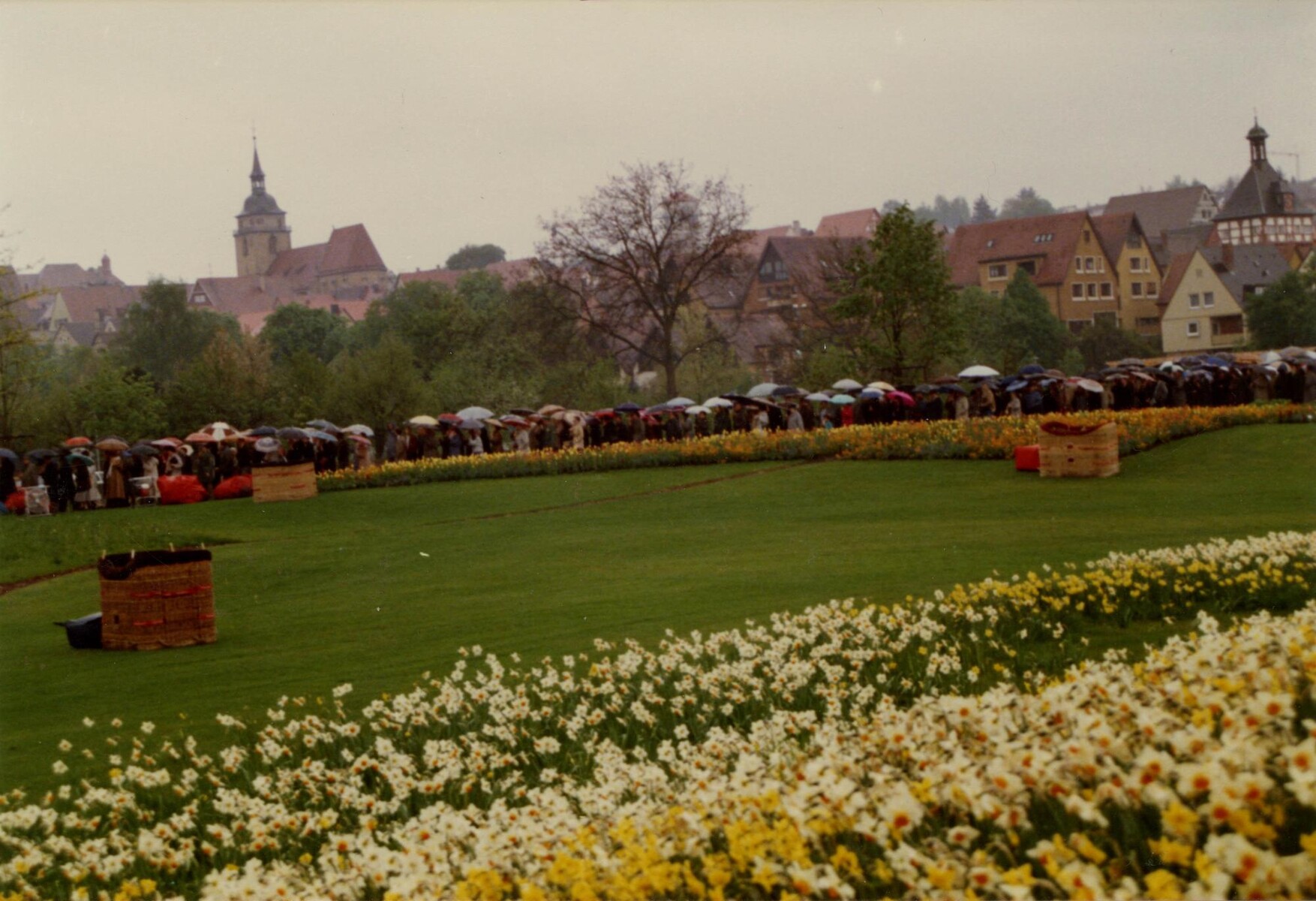 Bei strömendem Regen und kalten 6°C wurde vor 35 Jahren die Landesgartenschau im Bietigheim-Bissingen am Freitag, 28. April 1989 eröffnet. Rund 5000 Gäste machten sich vom Marktplatz auf den Weg zum Haupteingang auf der alten Enzbrücke. In den Folgemonaten wurde die Landesgartenschau bis zum Schlusstag am 17.9.1989 von der Sonne verwöhnt. Insgesamt wurden an den 143 Öffnungstagen rund 1,6 Millionen Besucher gezählt.