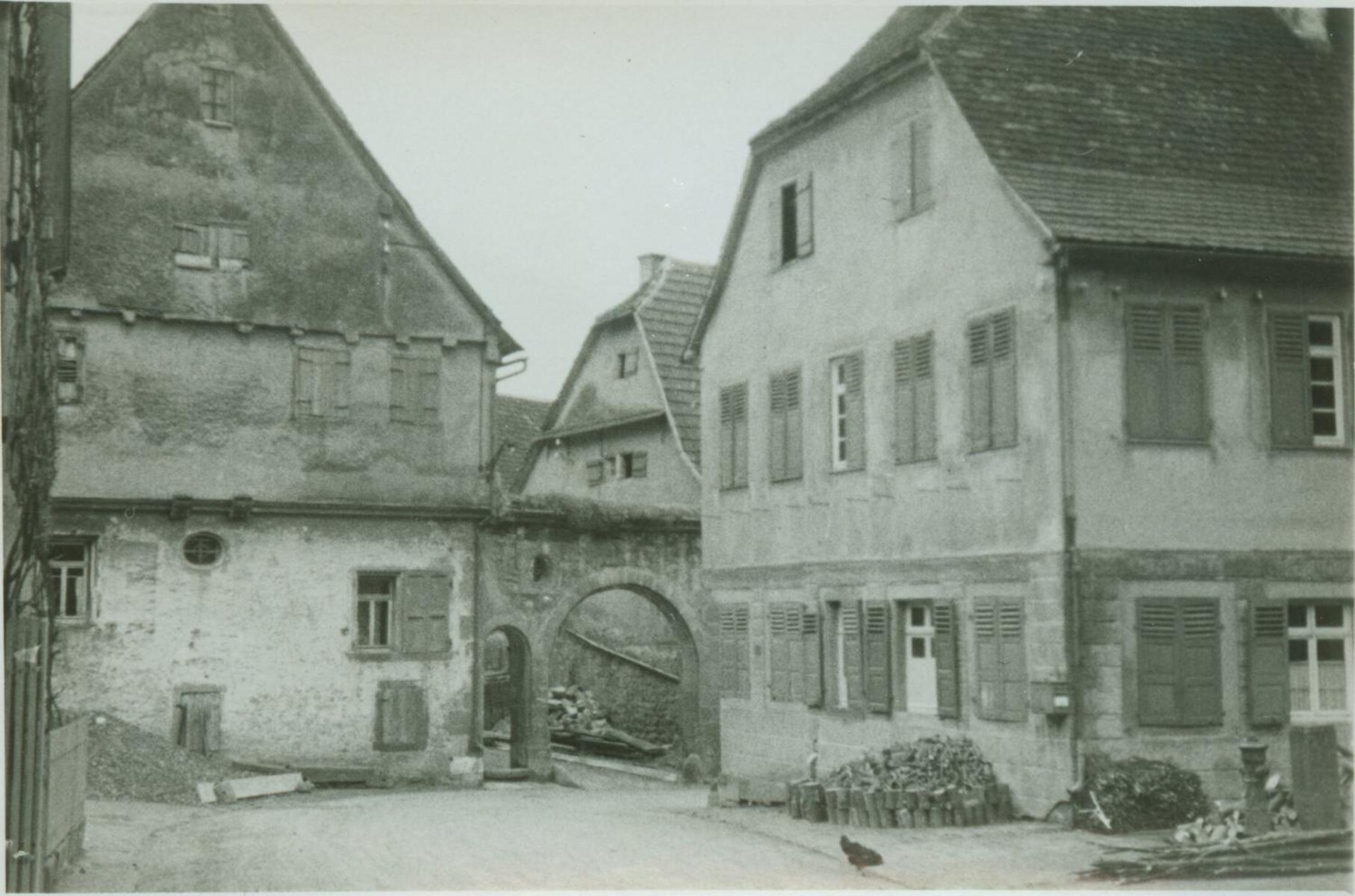 Rund 100 Jahre dürften zwischen diesen beiden Fotos in Metterzimmern vergangen sein: links das Haus Klosterhof 1, rechts das Metterzimmerer Rathaus. Hühner sieht man heute in der Rathausstraße nicht mehr, dafür Autos. Das Rathaus ist inzwischen als Wohnhaus in Privatbesitz. Der „Klosterhof“ ist eine große, geschlossene Hofanlage mit Wohnhaus und rückwärtigen Wirtschaftsgebäuden.