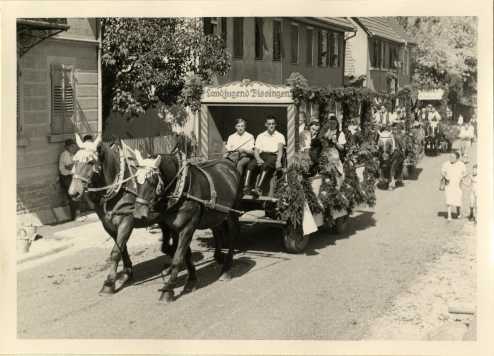 7 Festwagen der „Landjugend Bissingen“ in der Besigheimer Straße.