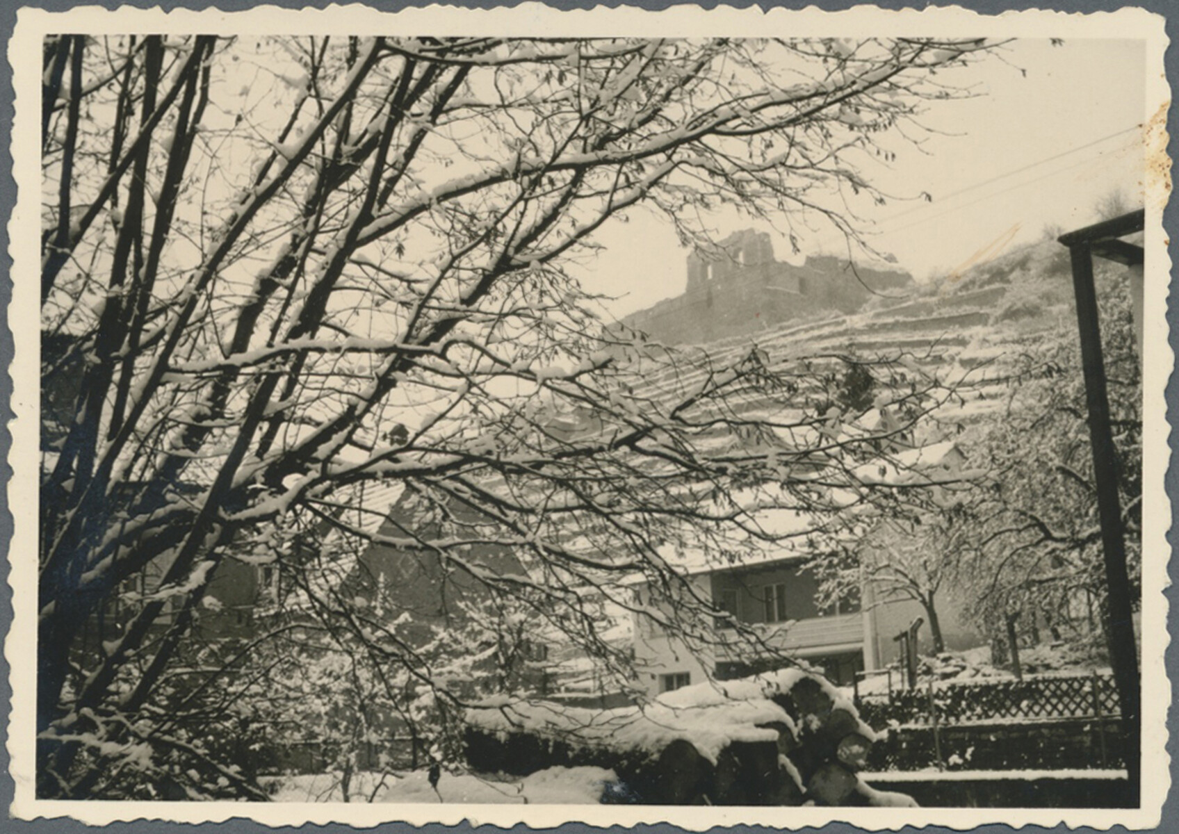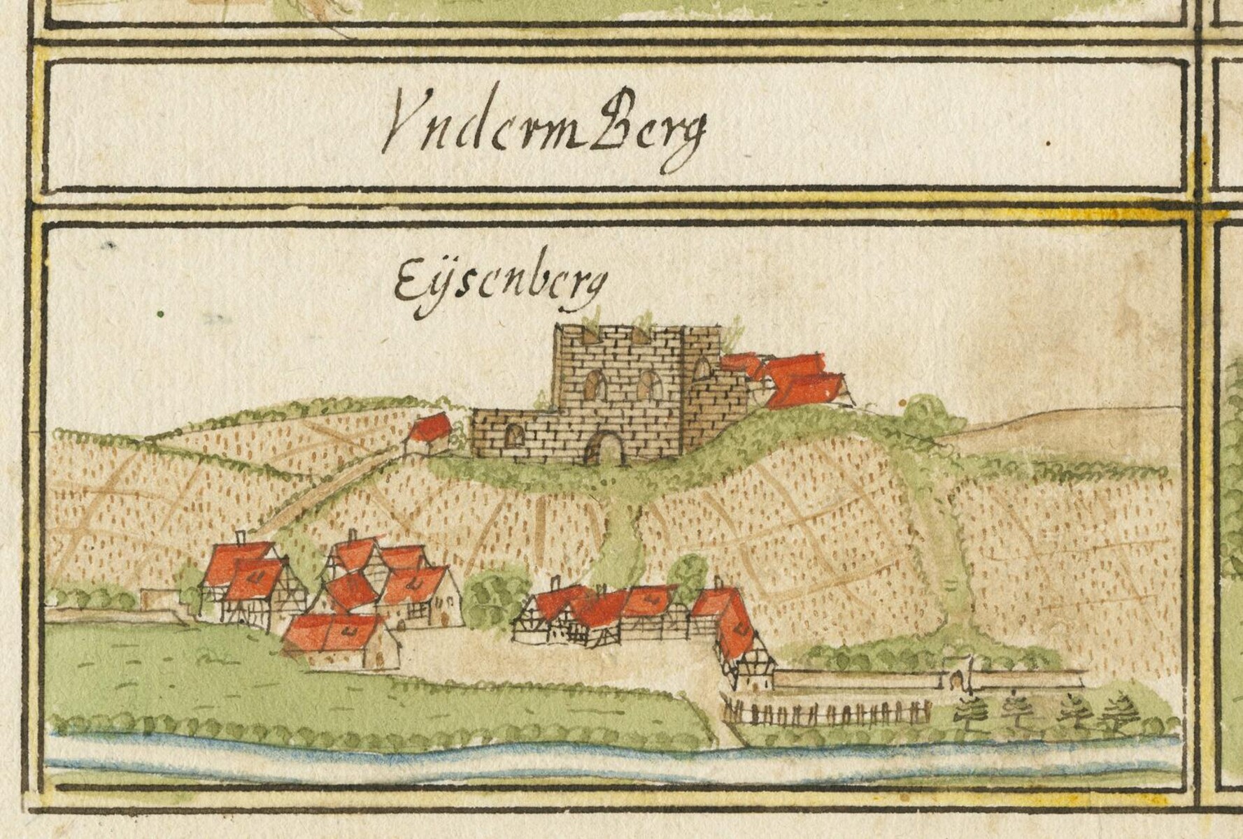 Die im 13. Jahrhundert erbaute klassische Höhenburg in Spornlage hatte schon viele Namen. Der heute geläufige Name „Altsachsenheim“ ist historisch nicht belegt. Die Burg wurde seit dem 15. Jahrhundert bis ins 19. Jahrhundert als „Äußere Burg“ oder „Eisenberg“ bezeichnet. Im 19. Jahrhundert taucht vereinzelt die Benennung „Obermberg“ auf. Üblicher war zu dieser Zeit aber die Benennung „Burg Untermberg“. Mit der Umgemeindung Untermbergs von Großsachsenheim nach Bissingen im Jahr 1953 setzte sich die Bezeichnung „Alt-Sachsenheim“ durch. Aber wer hat die Burg gegründet? Zunächst könnte man vermuten, dass es sich um die Stammburg der Herren von Sachsenheim handle. Eine Quelle für die Zuschreibung der Burg Altsachsenheim als besagte Stammburg konnte in den Archivalien aber nicht gesichtet werden. In der zweiten Hälfte des 14. Jahrhunderts wurden die Herren von Sachsenheim mit Remmigheim (damals Remmingen) belehnt, zu dem auch das heutige Untermberg gehörte. Untermberg wurde in einer Schrift von 1444 noch als „Remmingen unter dem Berg“ benannt. Es liegt nahe, dass die Burg durch die Herren von Remmingen gegründet und später als „Äußere Burg“ bezeichnet wurde. Das erste Foto zeigt die Burg Altsachsenheim Anfang des 20. Jahrhunderts. Die zweite Abbildung ist die Kiesersche Forstkarte von Untermberg (Werk 1680-1687) auf der die Burg als „Eysenberg“ markiert ist.