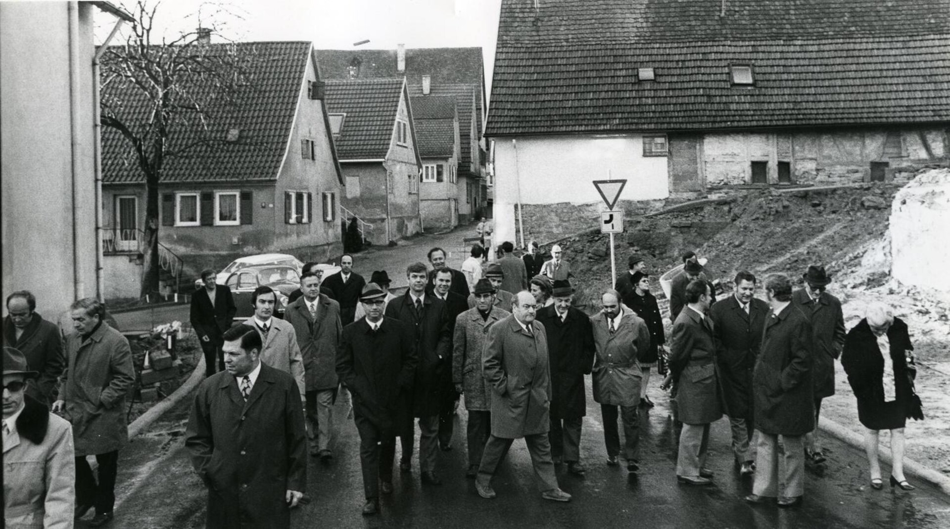 4 Der Gemeinderat besichtigt die Baustelle, vermutlich anlässlich der Kirchweihsitzung 1974 in Metterzimmern; der Fotograf ist nicht bekannt.